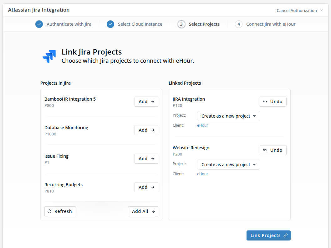 Once done, click Link Projects. eHour will: