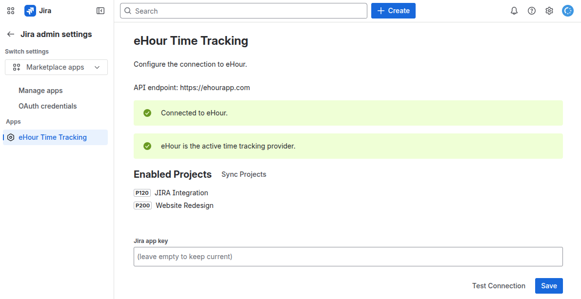 - Paste the Jira app key and click Test Connection.