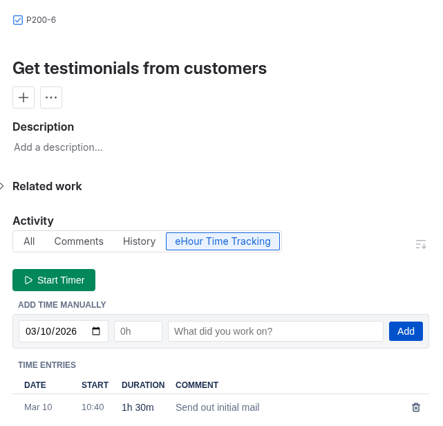 With the integration active in both directions, users now see an “eHour Time Tracking” tab on each ithe selected projects. From there they can start a timer, log time manually, and view all time already tracked for that issue.