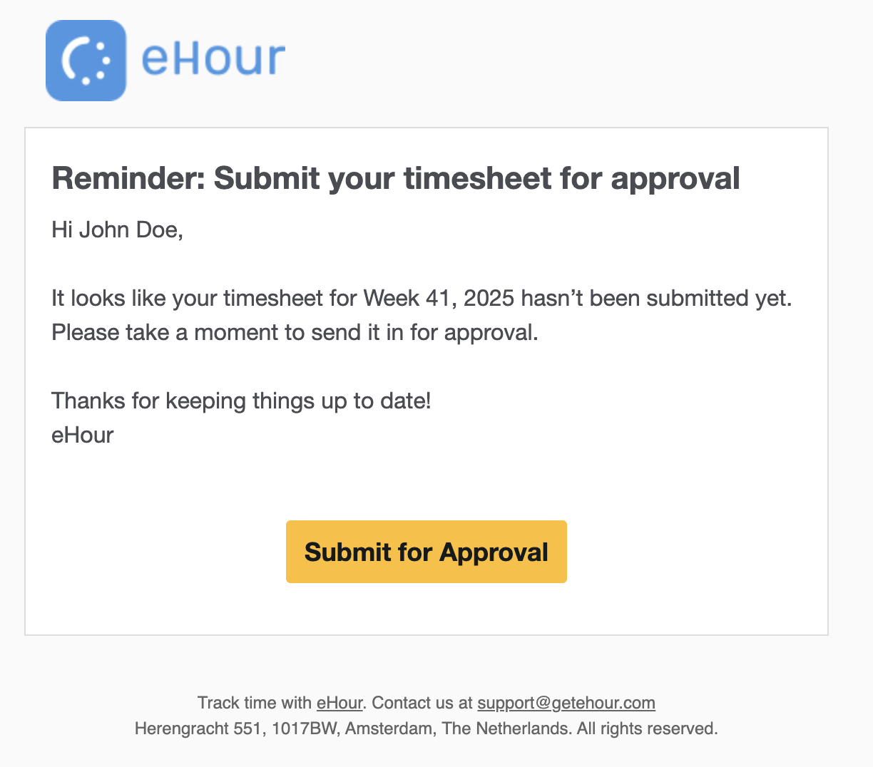 $name— the user's full name$period— the timesheet period (for example, Week 41 or October)A direct link to the user's timesheet is automatically included in each mail.